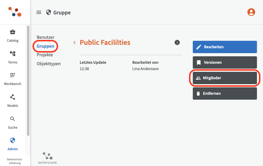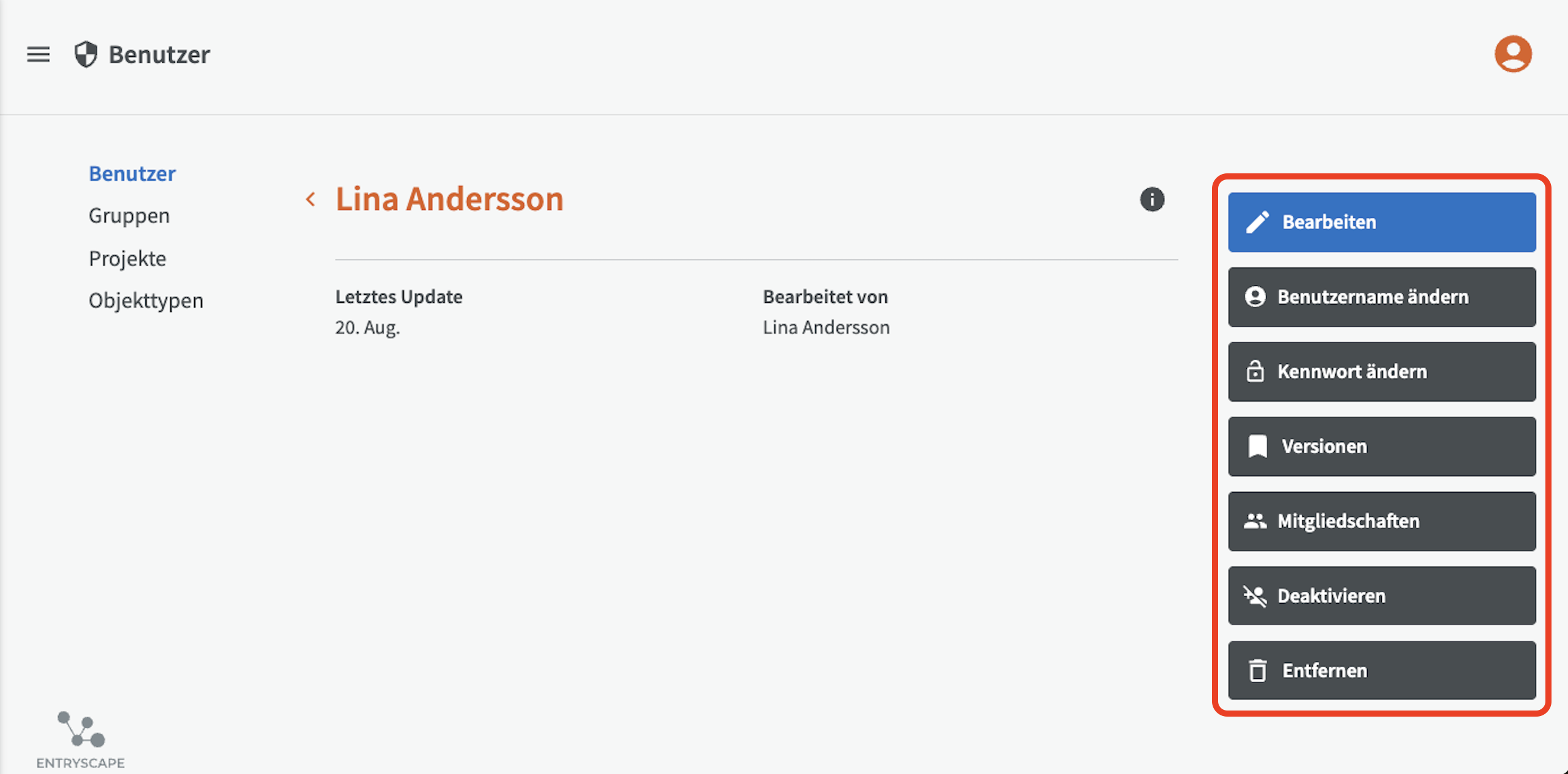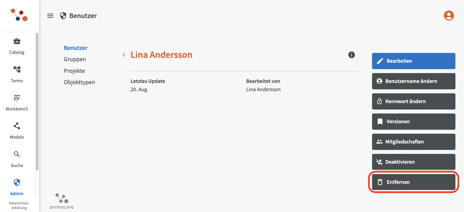 Im Admin-Modul haben Administratoren Zugriff auf mehr Verwaltungsfunktionen als Gruppenmanager, darunter die Möglichkeit, Benutzer zu deaktivieren oder zu entfernen. Die meisten benutzerbezogenen Aktionen können ansonsten in den Freigabeeinstellungen in den anderen EntryScape Modulen durchgeführt werden.