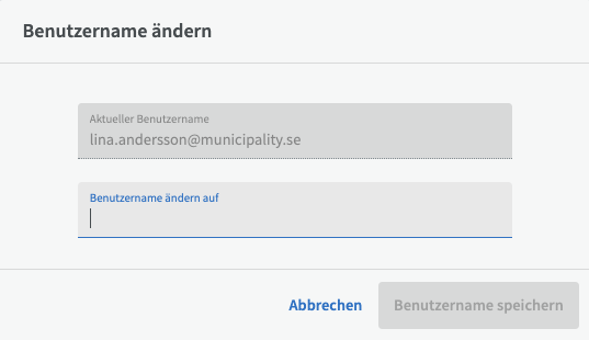 Sie können den Benutzernamen ändern, indem Sie auf die Schaltfläche Benutzernamen ändern klicken. Beachten Sie, dass der Benutzername eine gültige E-Mail-Adresse sein muss, damit der Benutzer sein Passwort zurücksetzen kann.