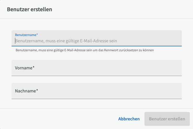 Um einen neuen Benutzer zu erstellen, klicken Sie auf die Schaltfläche Erstellen in der oberen rechten Ecke. Sie werden dann aufgefordert, den Benutzernamen, den Vornamen und den Nachnamen der Person einzugeben. Beachten Sie, dass der Benutzername eine gültige E-Mail-Adresse sein muss, wenn der Benutzer sein Passwort zurücksetzen möchte.
