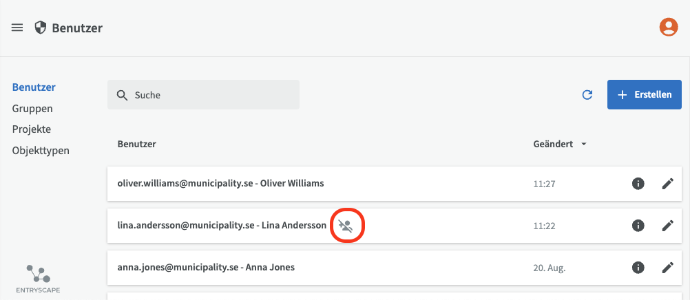 Als Administrator können Sie einen Benutzer deaktivieren. Die Daten eines deaktivierten Benutzers bleiben im System erhalten und sind in Version-Historien usw. sichtbar, aber der Benutzer kann sich nicht mehr bei EntryScape anmelden. Dies ist beispielsweise nützlich, wenn jemand die Organisation verlässt, bevor das Konto gelöscht wird.
