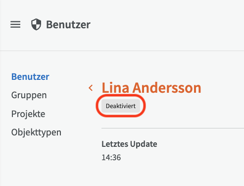 In der Benutzerliste wird durch ein Symbol angezeigt, dass der Benutzer deaktiviert ist, und wenn Sie auf den Benutzer klicken, wird zusätzlich ein kleines Deaktivierungs-Tag angezeigt.
