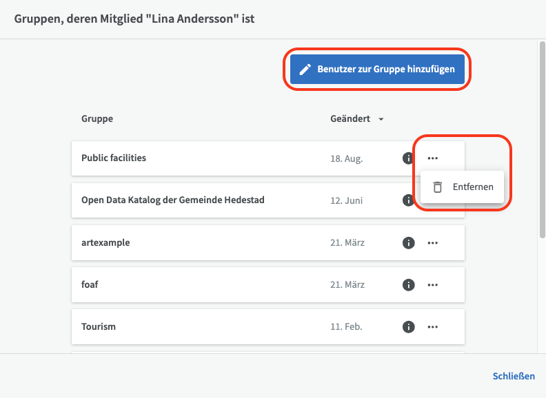 Um anzuzeigen und zu ändern, in welchen Gruppen ein Benutzer Mitglied ist, klicken Sie auf die Schaltfläche Mitgliedschaften. Daraufhin wird eine Liste aller Gruppen des Benutzers angezeigt. Dort können Sie über die Schaltfläche Benutzer zur Gruppe hinzufügen auch einen Benutzer zu einer Gruppe hinzufügen oder einen Benutzer aus einer Gruppe entfernen, indem Sie auf das Dreipunktmenü einer Gruppe klicken und Entfernen auswählen.