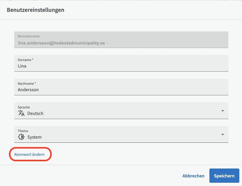Wenn Sie auf "Einstellungen" klicken, erhalten Sie einen Dialog, in dem Sie Ihren Namen, Ihre Sprache und Ihr Thema ändern sowie einen Link zum Kennwort ändern finden können.