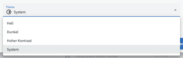 Die Themenauswahl ermöglicht es Ihnen, das Erscheinungsbild von EntryScape zu ändern. Sie können ein helles oder dunkles Thema, hohen Kontrast wählen oder Ihre bestehenden Systemeinstellungen das Erscheinungsbild bestimmen lassen (Standardeinstellung).