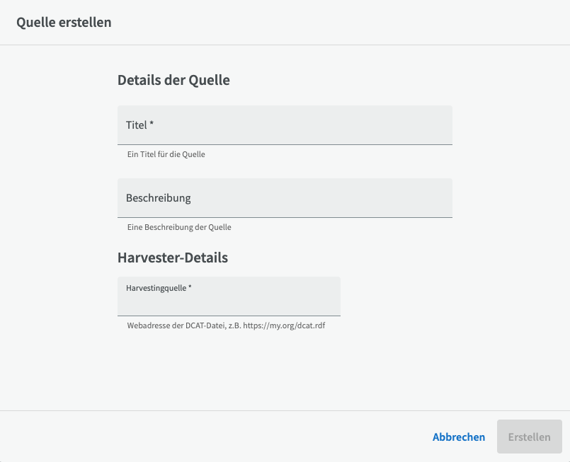 Um einen Datenkatalog harvesten zu können, muss zunächst die entsprechende Harvesting-Quelle hinzugefügt werden. Eine Organisation kann eine oder mehrere Harvesting-Quellen mit separaten Harvesting-Webadressen haben.