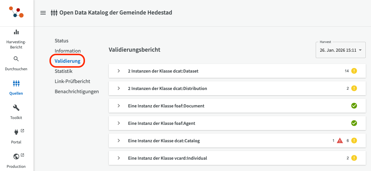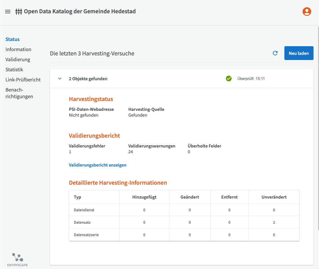 Unter "Linkprüfungsbericht" können Sie sehen, wie viele Links funktionieren und wie viele defekt sind im Datenkatalog der Harvesting-Quelle.