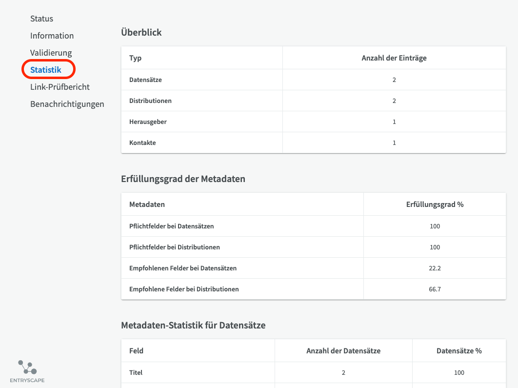 Sie können Statistiken zu den Metadaten einer Organisation anzeigen, indem Sie im linken Menü auf "Statistik" klicken.