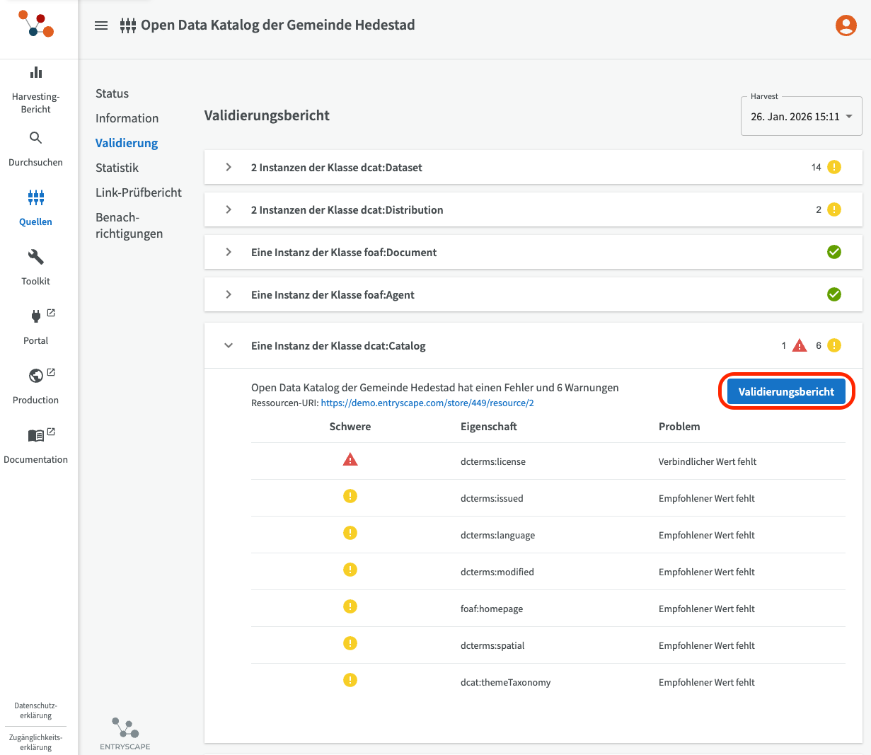 Wenn Sie auf "Validierung" klicken, können Sie sehen, ob es Probleme mit den Metadaten gibt. Sie sehen dann eine Zusammenfassung der Validierungsergebnisse pro Objekttyp/Klasse.
