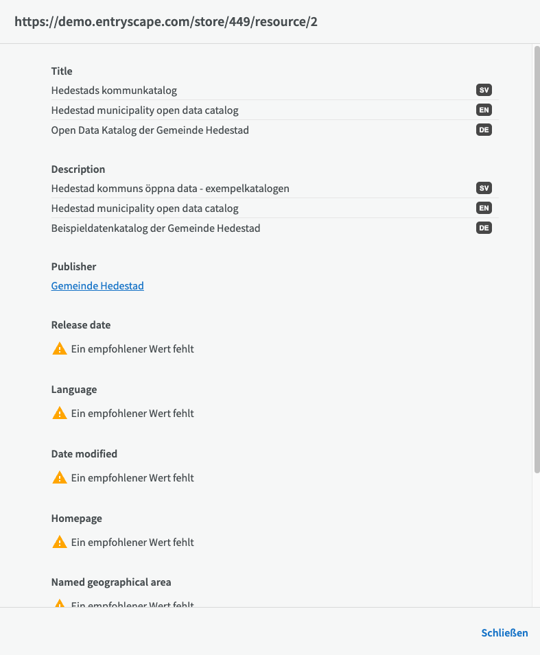 Die Felder werden dann in derselben Reihenfolge angezeigt, wie sie in EntryScape Catalog erscheinen, mit Warnsymbolen und Fehlern, die unter jedem Feld beschrieben sind.