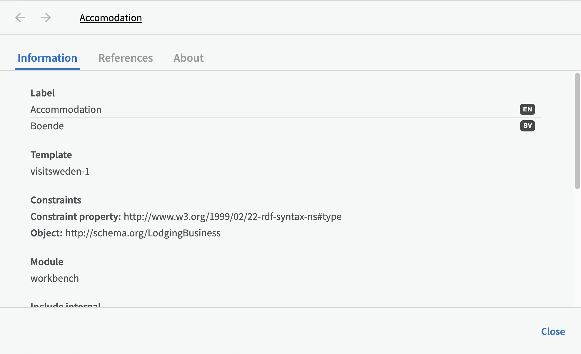 On the Entity types page you can view the different entity types and their properties, but not edit them. Click on the information symbol on the right side, to get more information about the entity type.