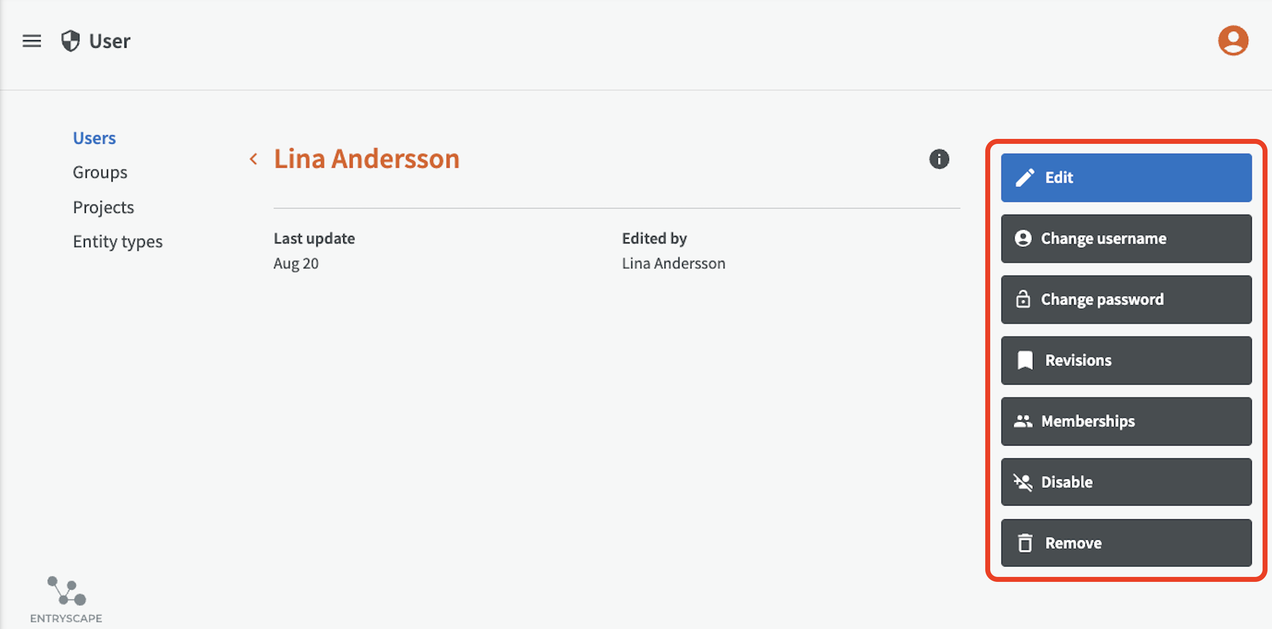 In the Admin module, administrators have more management capabilities than group managers, including the ability to disable or remove users. Most user-related actions can otherwise be performed in Sharing Settings in EntryScapes' other modules.