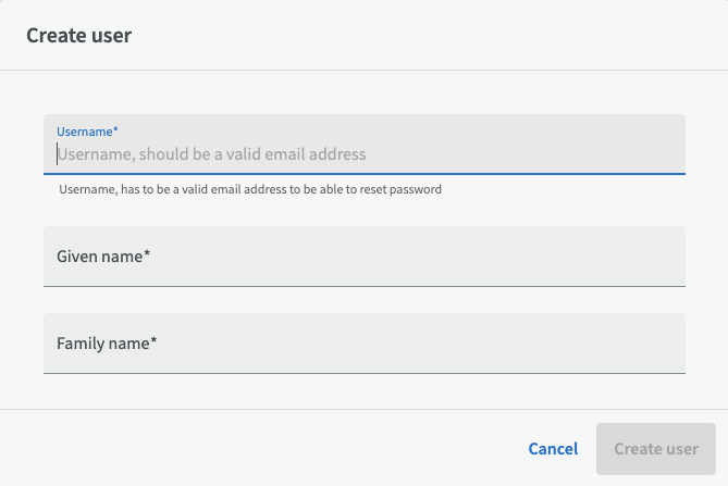 To create a new user, click the "Create" button in the upper right corner. You will then be asked to enter the person's username, first name, and last name. Note that the username must be a valid email address if the user wants to be able to reset their password.