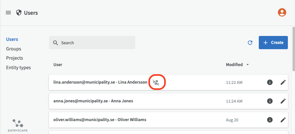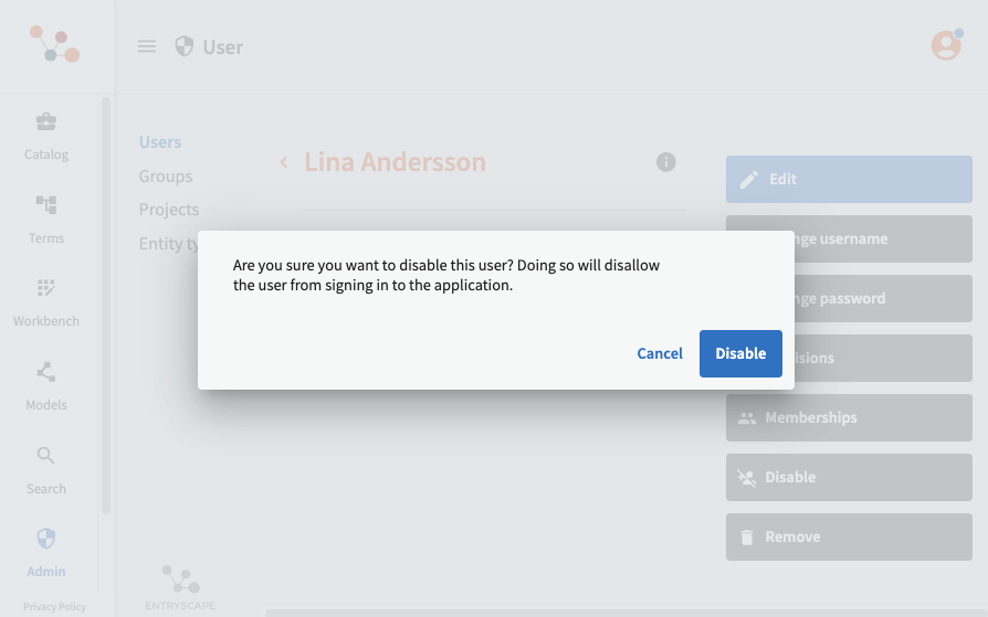 As an administrator, you can disable a user. A disabled user's data remains in the system and is visible in revision histories etc., but the user can no longer log in to EntryScape. This is useful, for example, when someone leaves the organization, before the account is deleted.