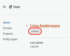 In the list of users, an icon indicates that the user is disabled, and if you click on the user, there is also a small disabled tag.