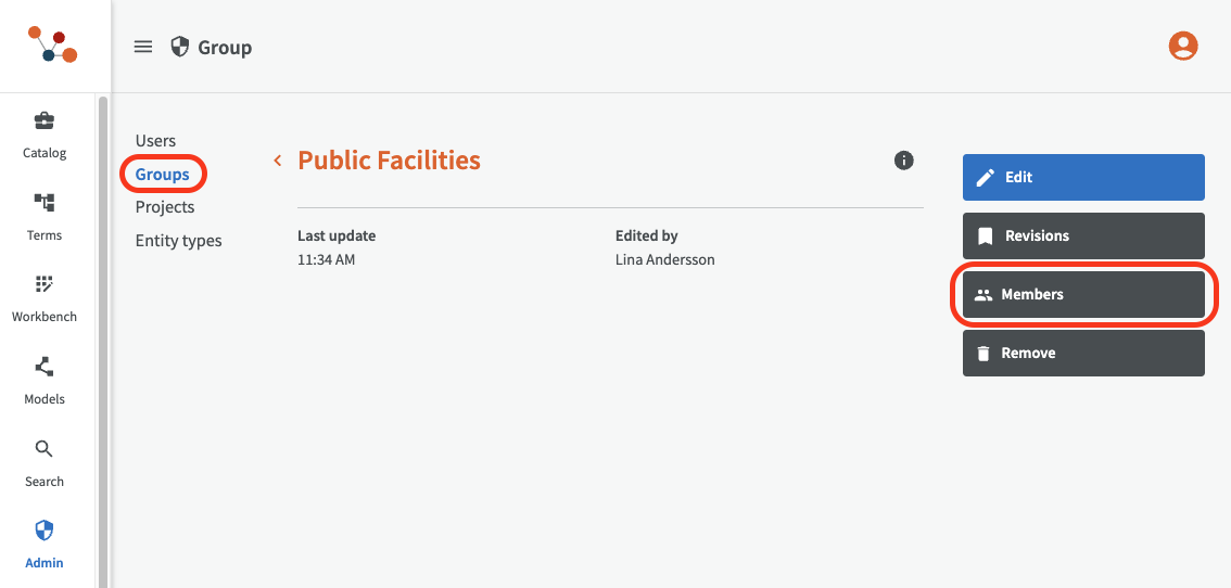 - Downgrade the user who is to be removed, from group manager to regular member. You also do this in EntryScape Catalog, Workbench, or equivalent.
