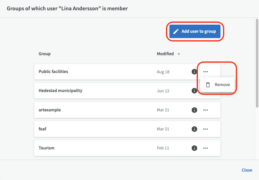 To view and change which groups a user is a member of, click on the “Memberships” button. You will then see a list of all the user's groups. There, you can also add a user to a group via the “Add user to group” button or remove a user from a group by clicking on the three-dot menu for a group and selecting “Remove”.