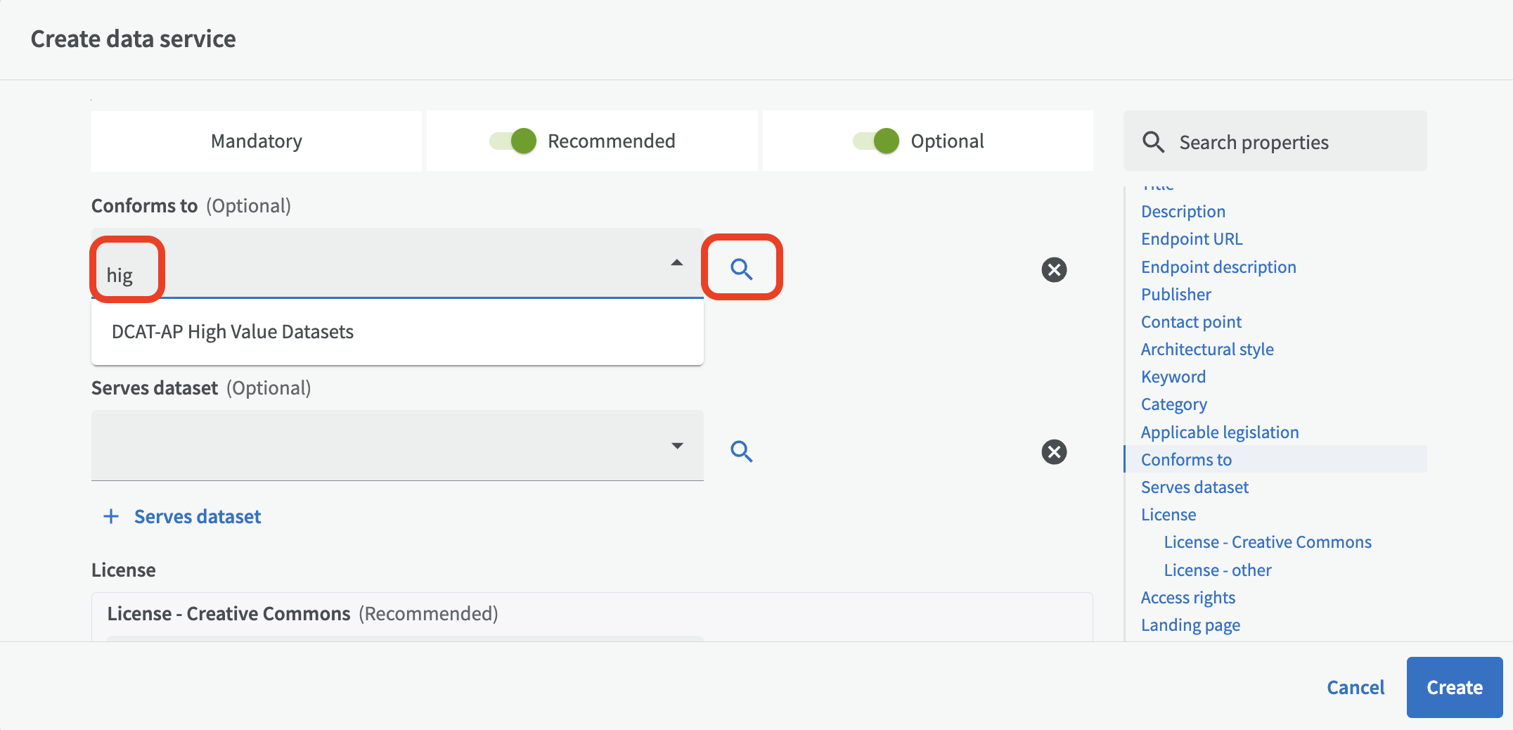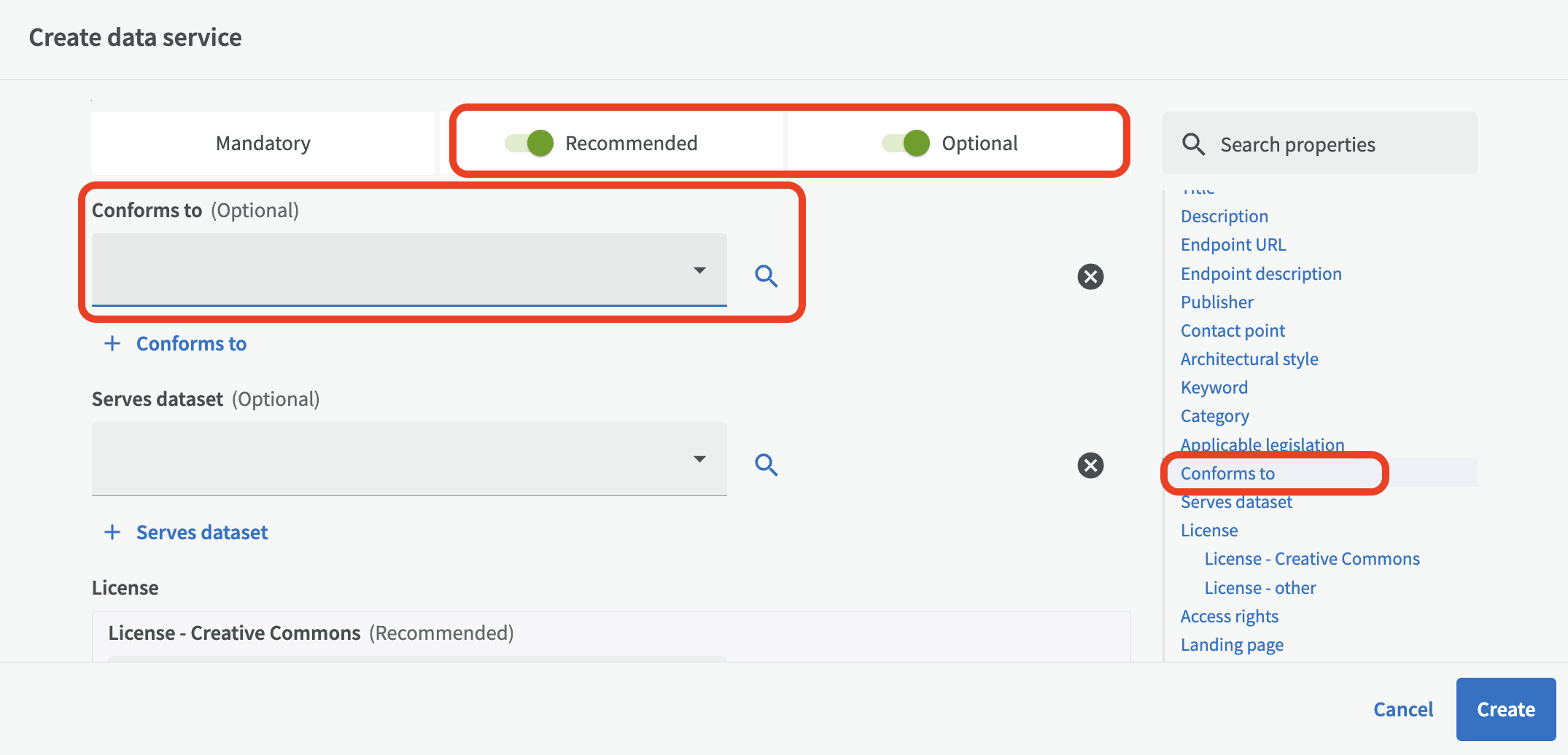 The "Conforms to" field is used to refer to a specification or implementation rule that applies to the data service. Depending on whether you are running DCAT 3 or DCAT 2, the "Conforms to" field can be found under Recommended fields or Optional fields.
