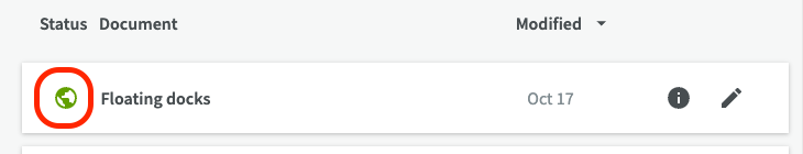 Documents get the same publication status as the catalog they are located in. If the catalog is public, the document will also be public (green globe). If the catalog is not published, the document will not be published (black globe).