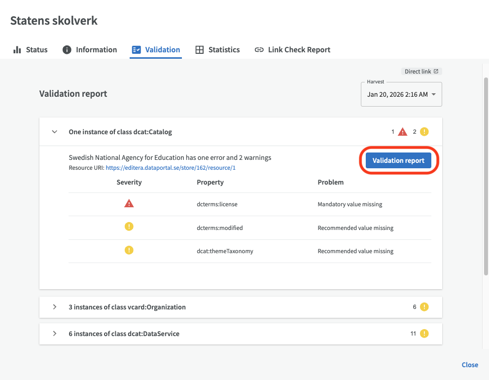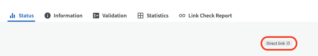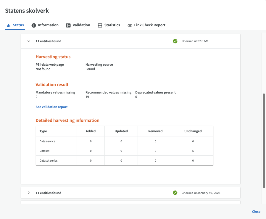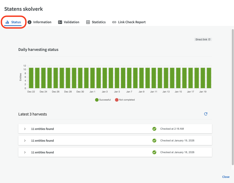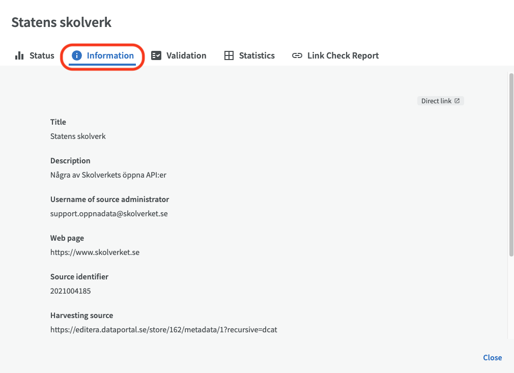 If you click on a harvesting source you can see the harvest details. There are five different tabs: Status, Information, Validation, Statistics and Link Check Report. Each view also has a direct link so that you can open it in a separate browser tab if you want to share the link to the view with someone else.