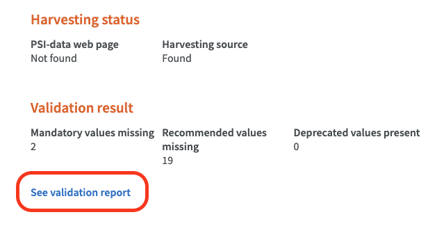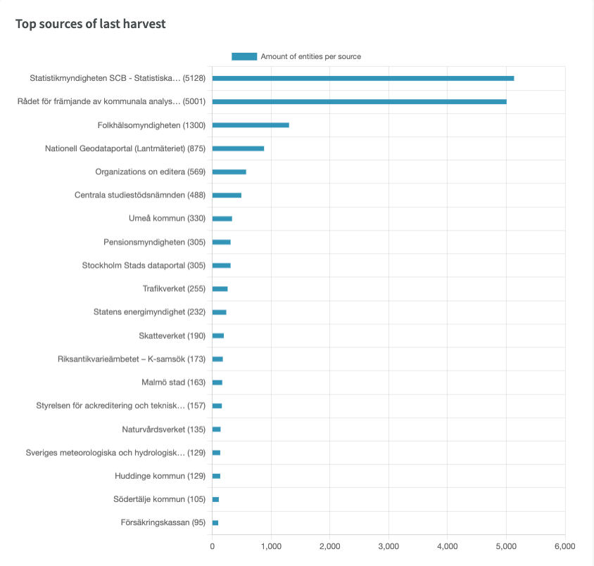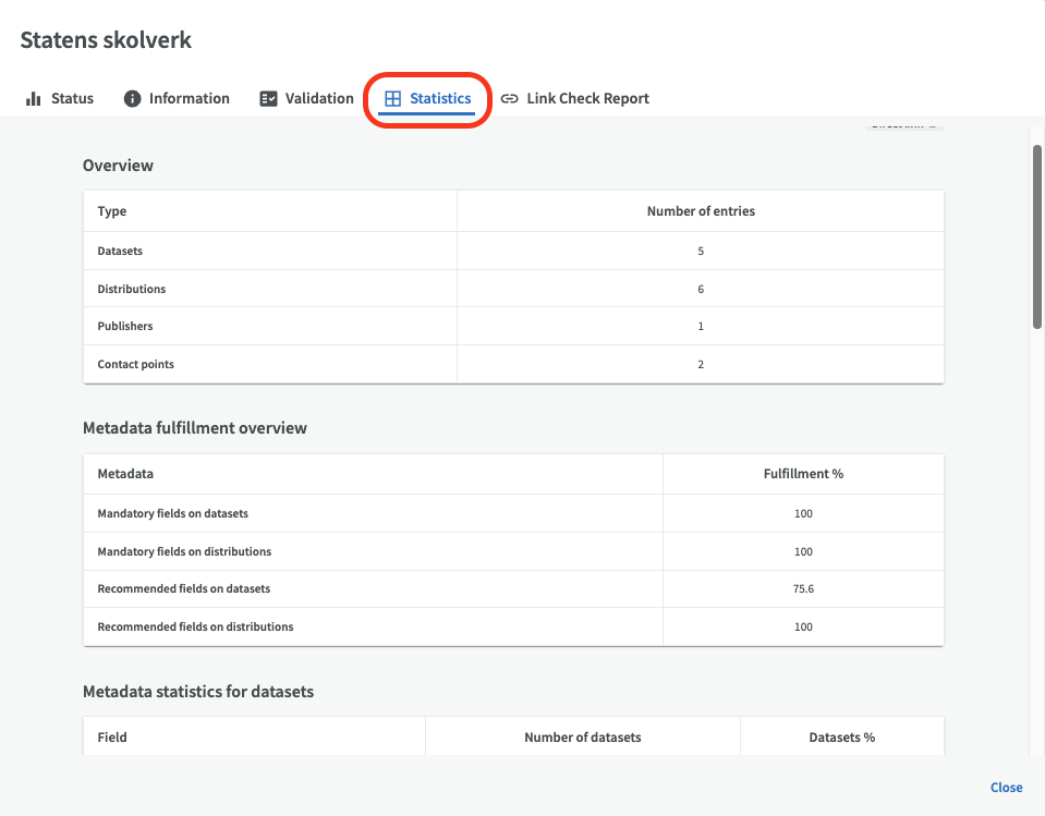 Under the "Statistics" tab you can see how many entities of different kinds have been harvested as well as how many of their mandatory input fields or recommended input fields are filled in.