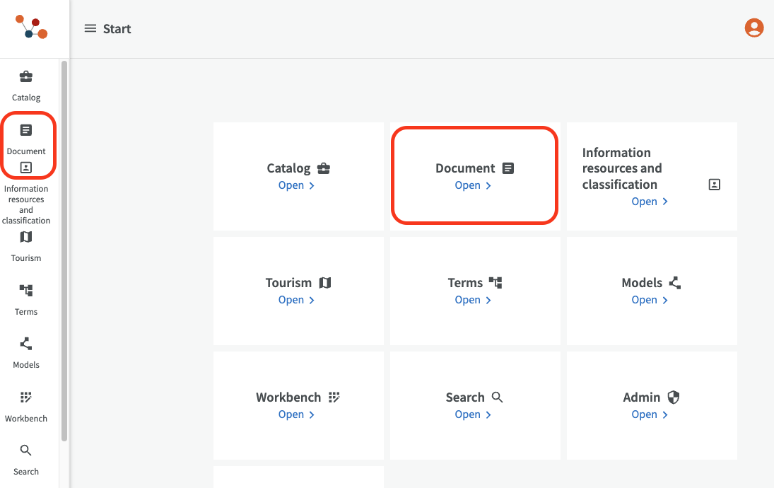 It is possible to have shortcuts, customizable project modules at the top level, instead of going through Workbench. Examples of project modules could be “Documents,” and “Tourism” with customized application profiles and metadata fields. EntryScape can be configured with this functionality for users when needed.