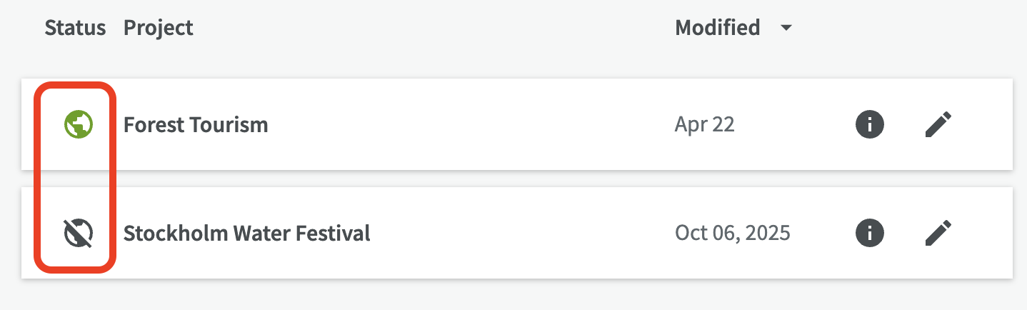 All newly created projects are unpublished by default, and only users with the appropriate permissions can view and manage the project. If the project is shown with a green published icon (globe), it means that the project's metadata is publicly readable and ready to be harvested by e.g. open data portals.