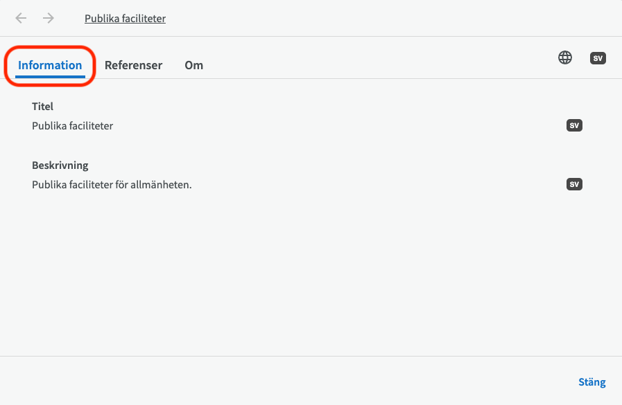 I den första fliken, "Information", kan du se titel och beskrivning för entiteten.
