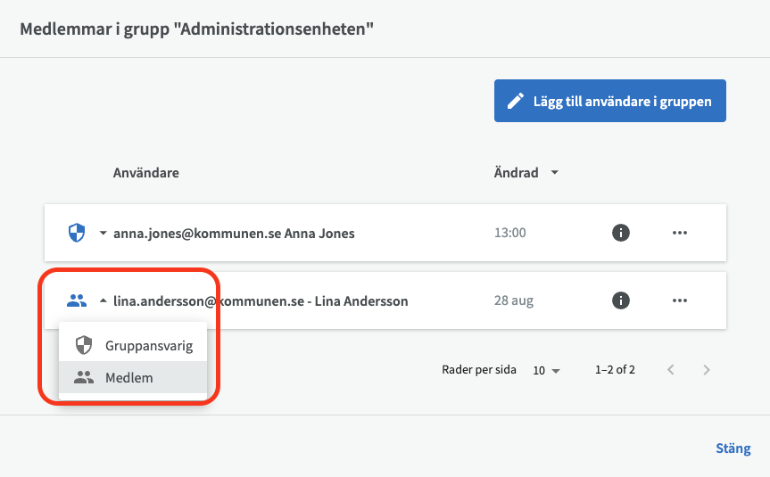 Du kan också ändra behörigheterna för medlemmar i gruppen, via behörighetsikonerna till vänster om namnet. Där kan du välja om en medlem ska vara gruppansvarig eller vanlig medlem. Gruppansvariga kan lägga till och ta bort medlemmar i gruppen, samt ändra deras behörigheter.