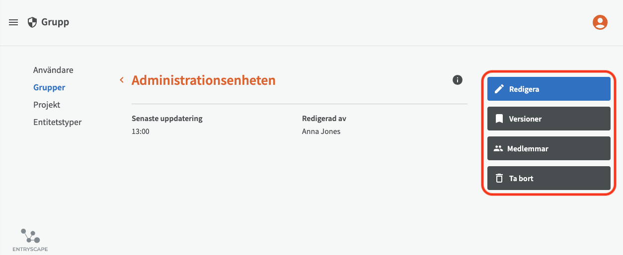 Med gruppverktyget i EntryScape Admin kan du skapa och ta bort grupper, lägga till och ta bort medlemmar ur grupper samt sätta deras behörighetsnivå (vanlig medlem eller gruppansvarig). Det finns både grupper av användare som hör till en specifik katalog, terminologi, modell eller projekt samt administriativa grupper som inte nödvändigtvis är kopplade till en särskild katalog eller liknande. En användare kan vara medlem i flera olika grupper och ha olika behörigheter i respektive grupp.