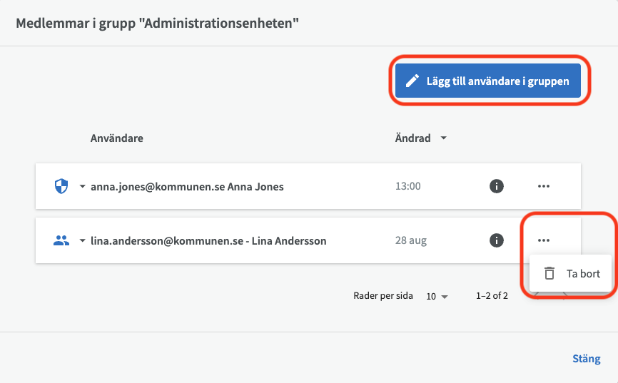För att hantera medlemmar i en grupp så klickar du på knappen "Medlemmar". Där kan du lägga till användare via knappen "Lägg till användare i gruppen" samt ta bort medlemmar ur gruppen via trepunktsmenyn och alternativet "Ta bort".