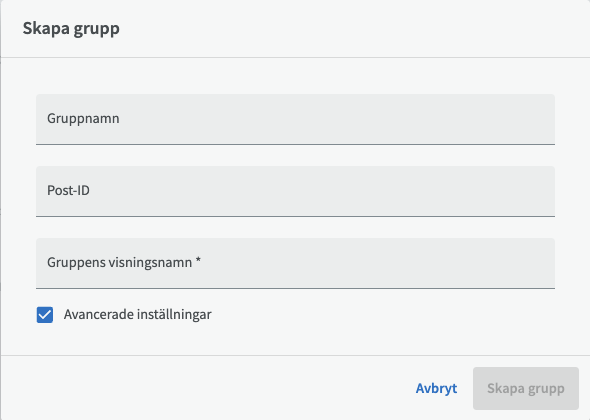 I specifika situationer där man vill kunna ange särskilda identifierare i till exempel konfigurationer, så kan man lägga till ett identifierande gruppnamn och ett post-ID till gruppen. Klicka då i "Avancerade inställningar" och fyll Gruppnamn samt Post-ID för gruppen. Observera att du inte kan ändra ett post-ID i efterhand.