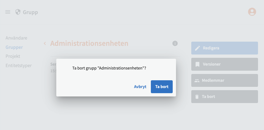 Du kan ta bort en grupp genom att klicka på knappen "Ta bort". Därefter får du bekräfta borttagningen.