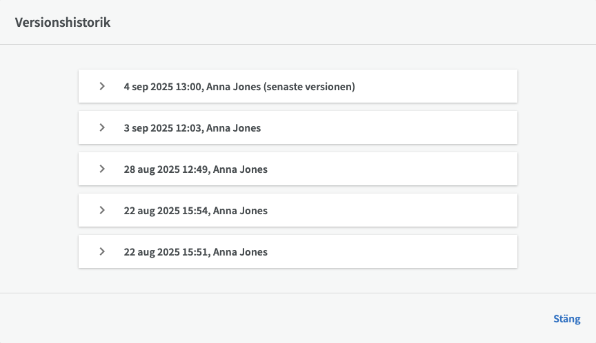 Om du vill se versionshistoriken för en grupp så klickar du på knappen "Versioner". Där kan du se datum för tidigare versioner av gruppens information samt återställa tidigare versioner.