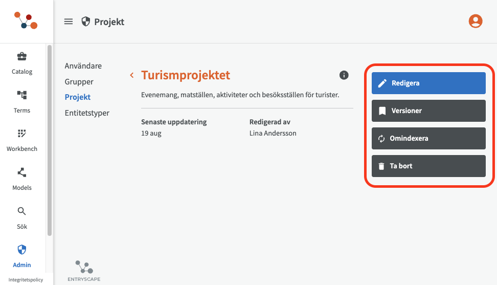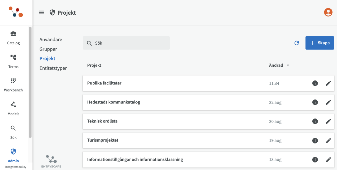 Under Projekt kan du överblicka alla projekt på din instans, där även alla kataloger, modeller och terminologier ingår.