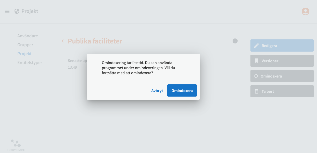 Om du upplever problem med att sökfunktionen för fritext inte fungerar som den ska, att sökresultat inte dyker upp, så kan en omindexering av projektet lösa problemet. Problemet kan uppkomma t ex på grund av en förändring i konfigurationen. Klicka på knappen "Omindexera" för att få ett nytt fräscht sökindex för projektet. Notera att detta kan ta några minuter.