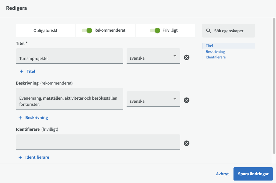 Om du klickar på ett projekt och sedan knappen "Redigera" så har du möjlighet att ändra projektets titel och beskrivning samt lägga till en identifierare för projektet.