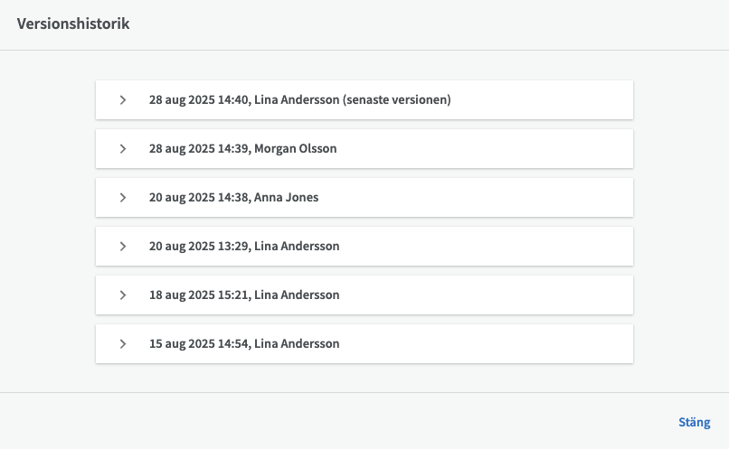 Du kan se versionshistoriken för ett projekt om du klickar på knappen "Versioner". Där kan du se datum för tidigare versioner av projektets information samt återställa tidigare versioner.