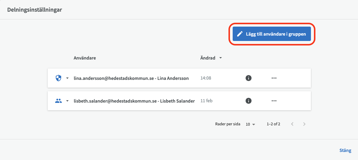 Gruppansvariga kan ändra behörigheter genom att gå in på katalogens översiktsvy och klicka på knappen ”Delningsinställningar”.