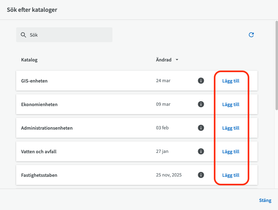 Då kommer det upp en lista med kataloger som du kan välja att lägga till som underkataloger till din överordnade katalog genom att klicka på "Lägg till"