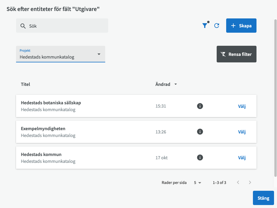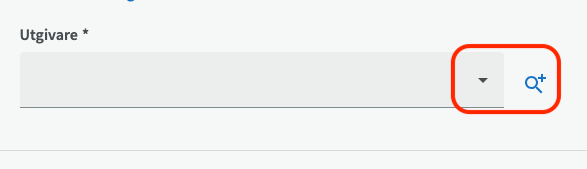 Om er organisation har fått EntryScape konfigurerat för att kunna återanvända redan befintliga utgivare, så får du välja utgivare genom att trycka på pilen eller förstoringsglaset. I annat fall skriver du bara in namnet på utgivaren.