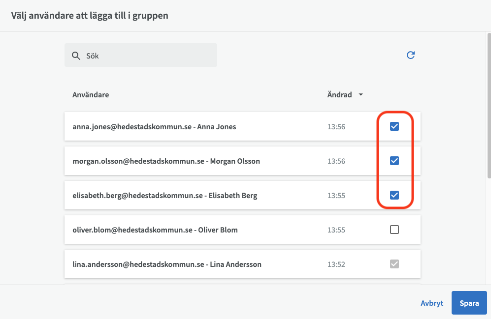Där kan du lägga till och ta bort användare till den grupp som har behörighet till katalogen. För att lägga till en användare till en grupp så klickar du på ”Lägg till användare i gruppen”.