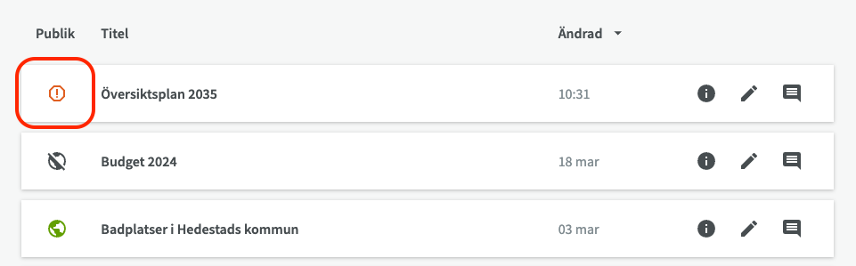 Utkastet visas i listan med en röd varningssymbol som visar att det är en ofullständig datamängd och det går inte att publicera datamängden förrän alla obligatoriska fält är ifyllda.
