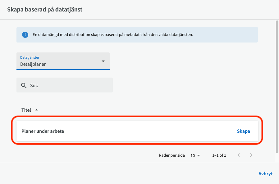 Innan du skapar en datamängd är det bra att först kontrollera att den inte redan finns. Du kan använda sökfunktionen för att söka bland tillgängliga datamängder i katalogen. Skriv i så fall in minst tre tecken för att kunna hitta matchande sökresultat.