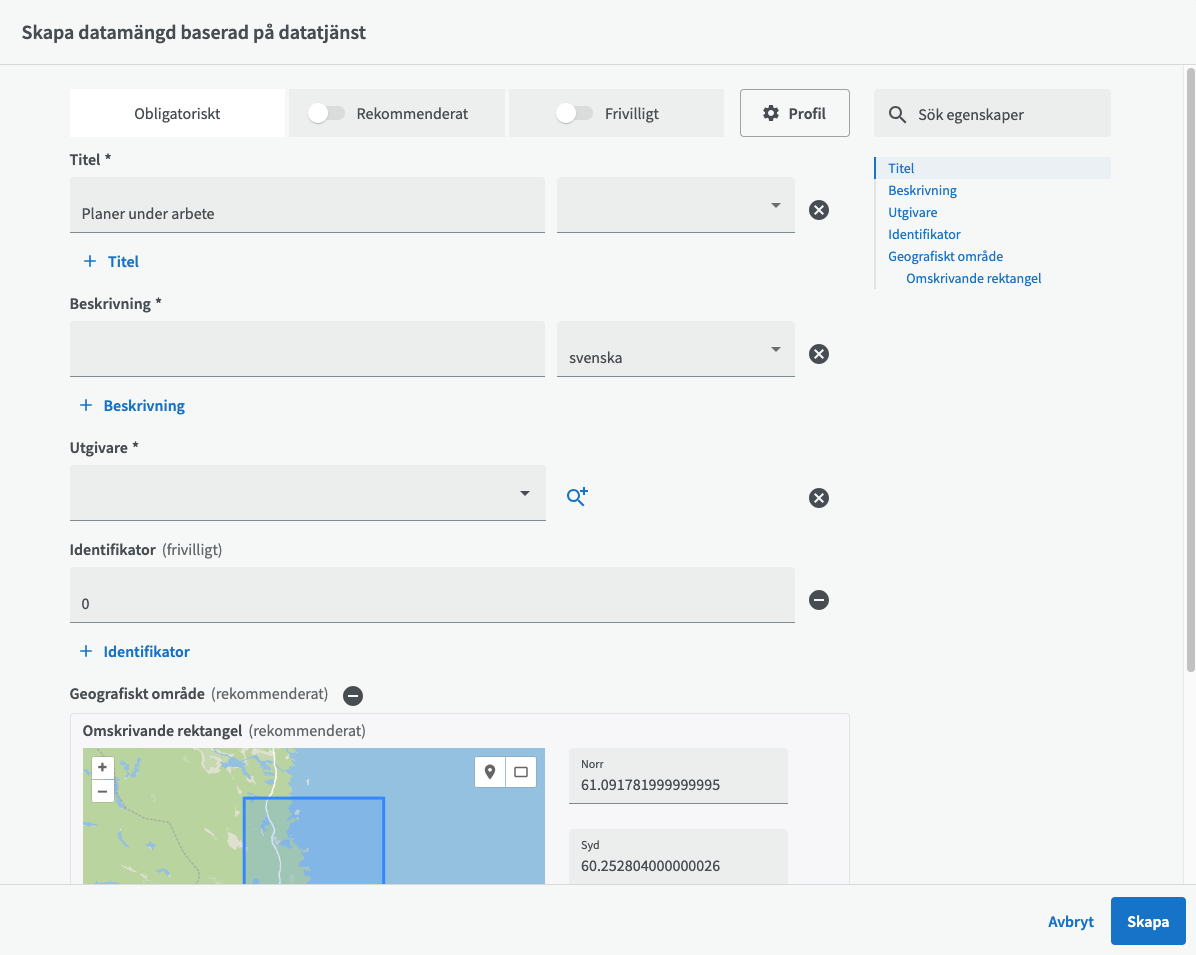 Genom att slå på rekommenderade respektive frivilliga inmatningsfält så kan du redigera beskrivningen ytterligare. För mer information om respektive inmatningsfält, se Redigera datamängd här nedanför.