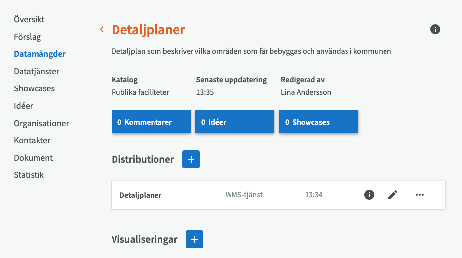 Du kan redigera en datamängd antingen genom att klicka på redigeringspennan i listan med datamängder, eller så kan du gå in på översiktssidan för en datamängd och klicka på knappen "Redigera".