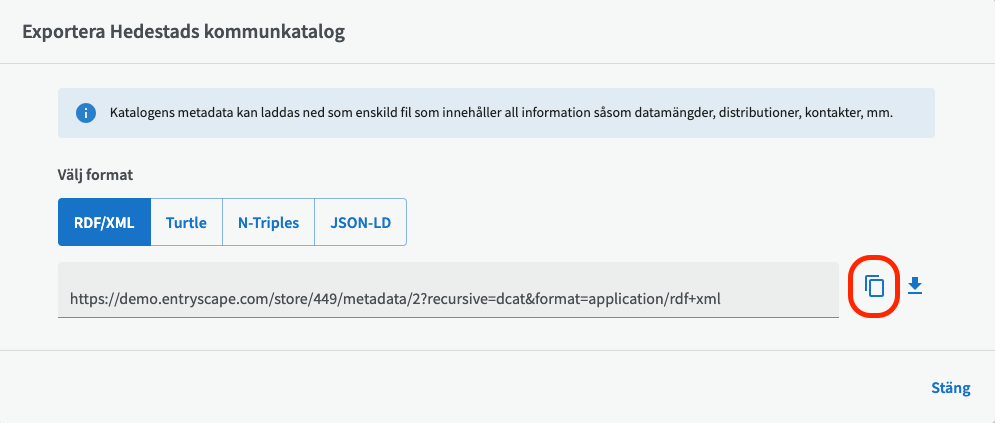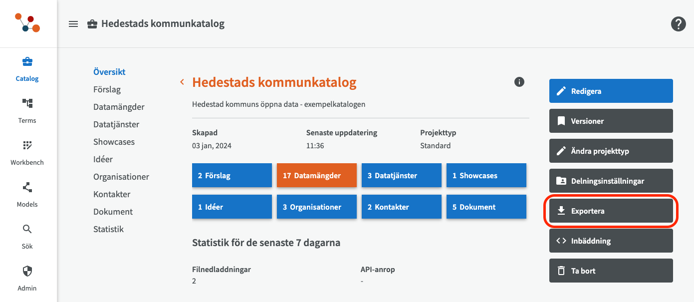 För att kopiera länken till din publicerade katalog i EntryScape Catalog, gå in på din katalog, klicka på knappen Exportera.