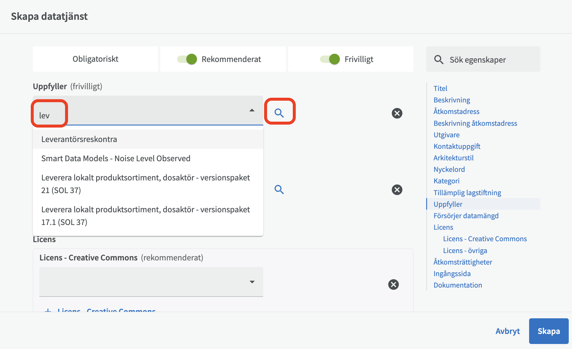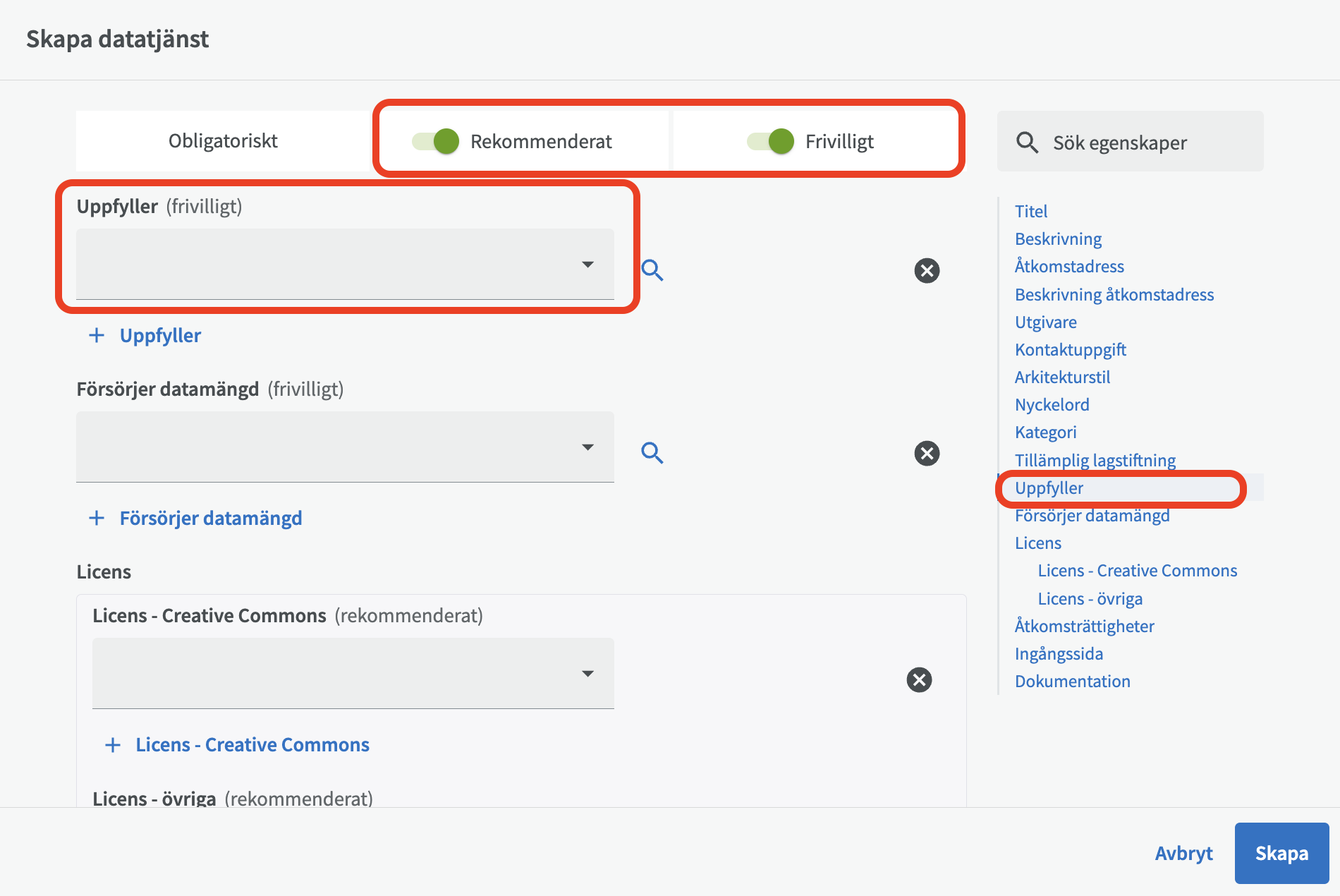 Om du dessutom klickar i att du vill se även rekommenderade och frivilliga fält så får du fylla i ytterligare information om datatjänsten, som till exempel licens m.m. Klicka sedan på "Skapa" för att skapa datatjänsten.