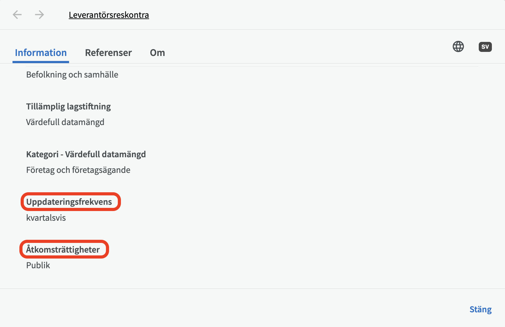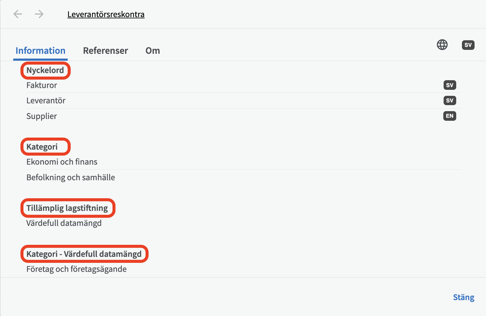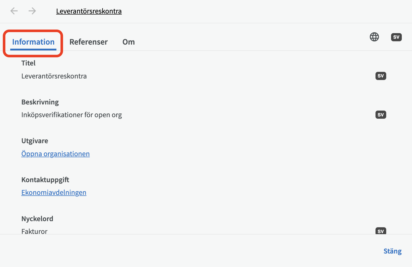 I den första fliken, "Information", kan du se metadata för den datamängd eller annan entitet som du har klickat på, samt länkar till alla entiteter som din entitet refererar till. Listan kan se annorlunda ut beroende på vilka metadata som är tillämpliga och ifyllda för entiteten.