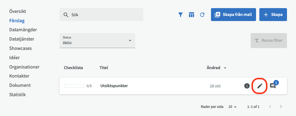 Under Förslag så ser du en lista över de påbörjade förslag på datamängder som du redan har tillgång till. Längst till vänster så syns en statusbar som talar om hur många krav som har uppfyllts i checklistan för att förslaget ska få uppgraderas till en publicerbar datamängd. Du kan läsa mer om checklistan under ”Klarmarkera förslag genom checklista” längre ner.