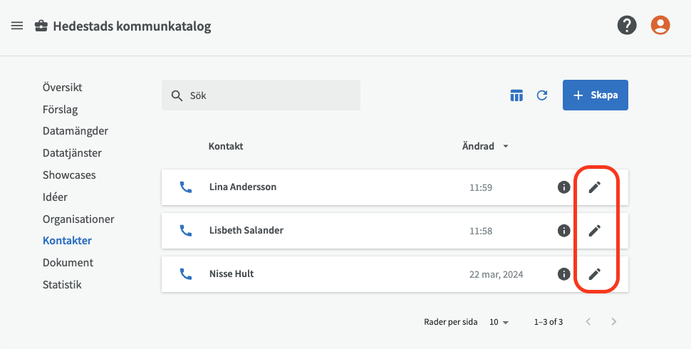 Om du vill redigera informationen om kontakten så klickar du på redigeringspennan längst ut till höger i listan över kontakter.